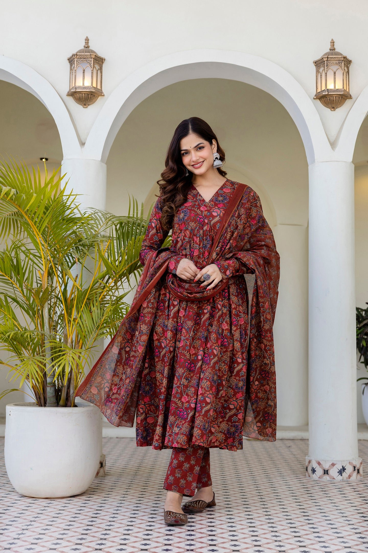 Ruhani Maroon Anarkali Suit Set with Mul Cotton Dupatta